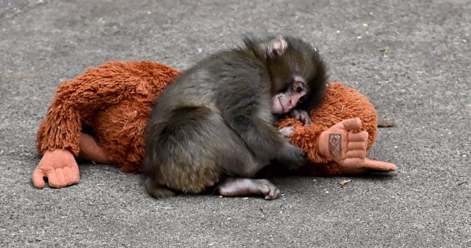 Eläintarhan hoitajat kertoivat myöhemmin, että sen emo hylkäsi poikasensa pian syntymän jälkeen viime heinäkuussa. Ilman emon hoivaa vauva löysi turvaa pehmolelusta, jota henkilökunta kuvailee eräänlaiseksi ”sijaisemoksi”.