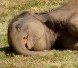 Tämä elefanttiemo yritti herättää poikastansa, joka nukkui maassa. Se tökki kärsällänsä hellästi poikastansa, joka ei herännyt. Emo alkoi nopeasti huolestumaan ja yritti parhaansa mukaan herättää pikkuista, joka pysyi liikkumattomana.
