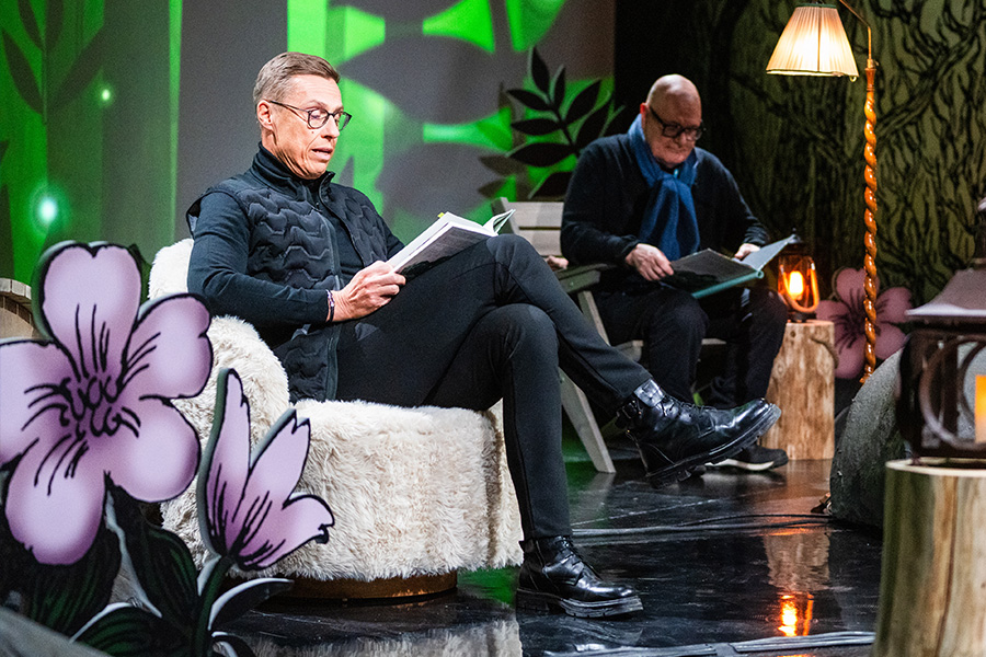 Presidentti Alexander Stubb ja toimittaja Ruben Stiller Muumit-lukumaratonissa. Kuva: Yle Pressi/Jukka Lintinen