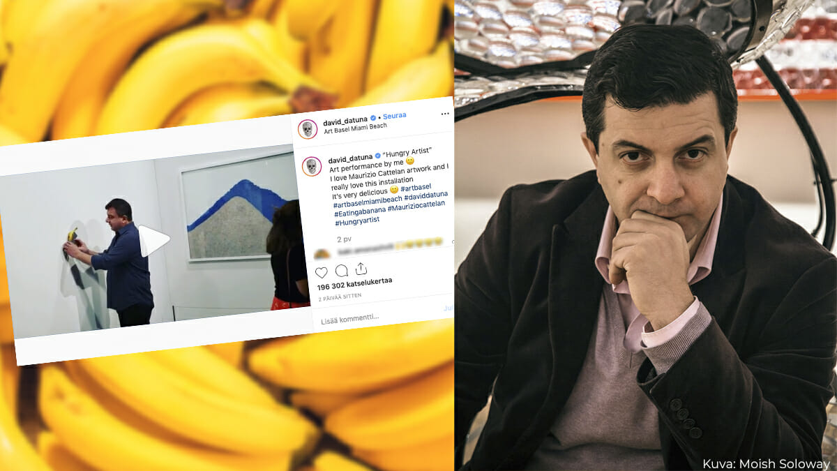 Performanssitaitelija David Datuna lähestyi taideteosta ja yhtäkkiä repäisi teipit irti. Tilanteesta otettu video näyttää Datunan syövän tyytyväisenä hintavan taideteoksen.