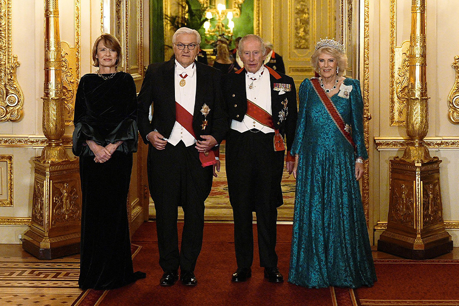 Saksan presidentti Frank-Walter Steinmeier sekä hänen vaimonsa Elke Budenbender kutsuttiin 3. joulukuuta kunniavieraina Windsorin linnan juhlaillalliselle kuningas Charlesin ja kuningatar Camillan puolesta.